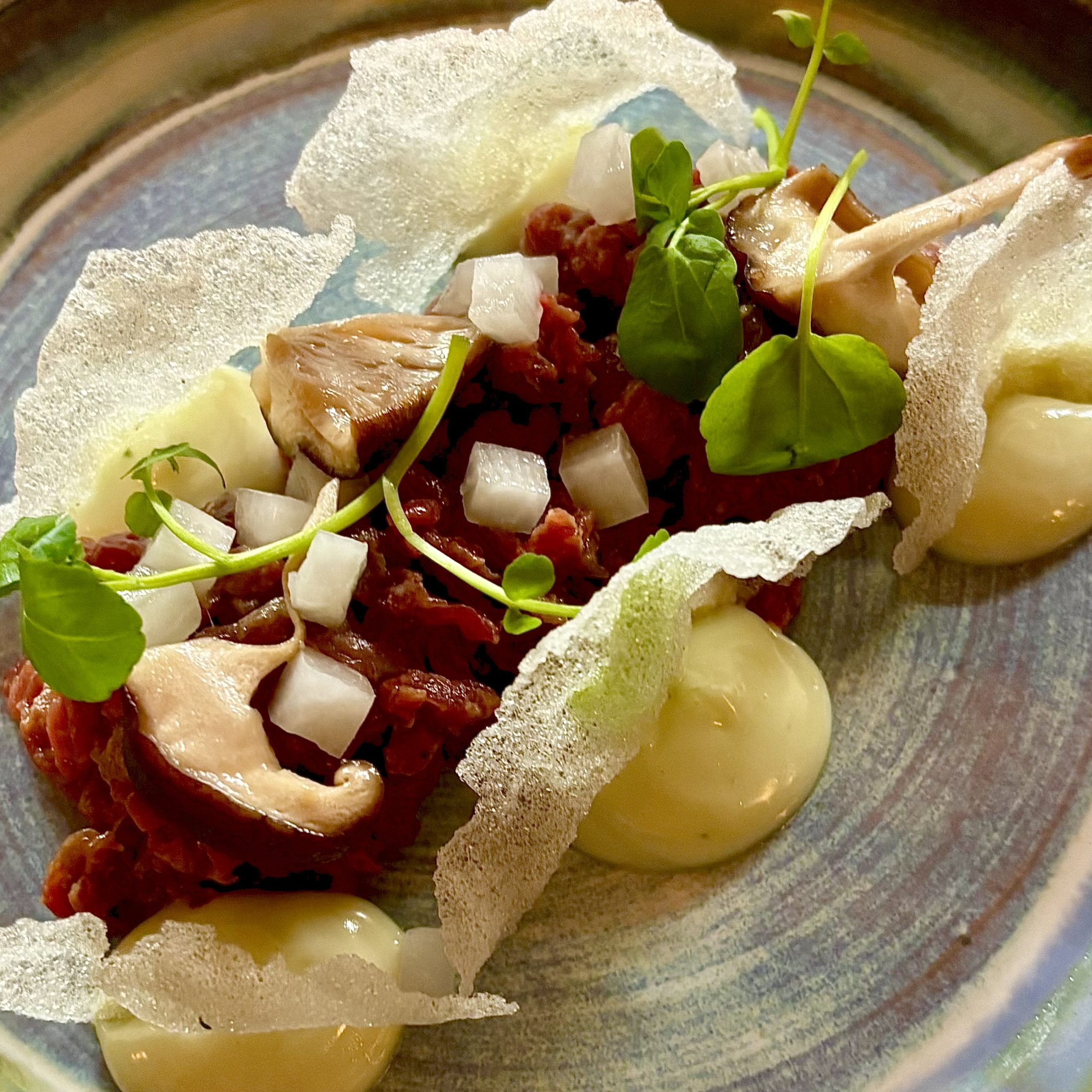 Bifftartar med soja, kapris, jalapeno, picklad svamp och jordärtskocka