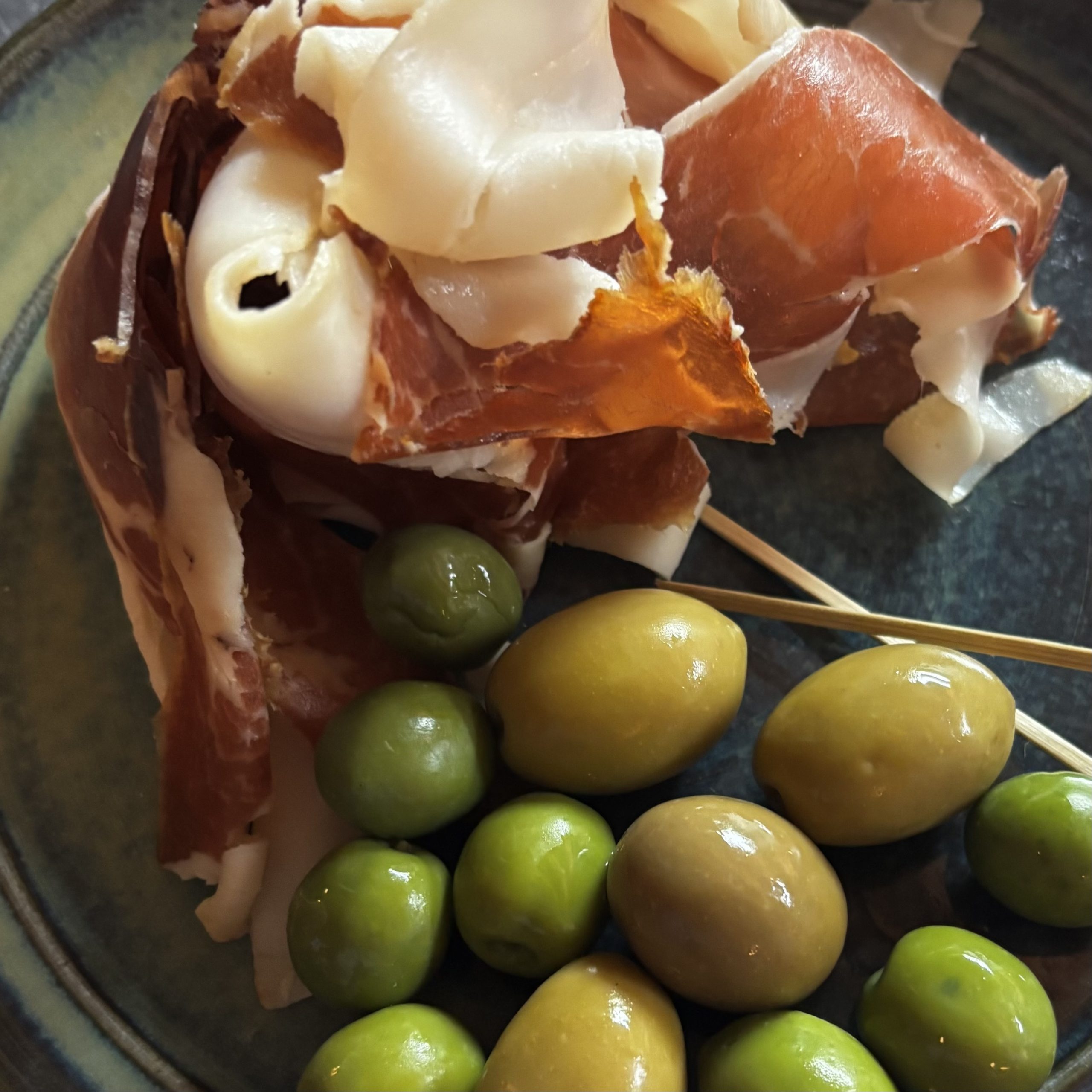 Charkuterier & oliver, N’Duja på crostini samt friterad minibläckfisk med chilimajonnäs och rökt paprika